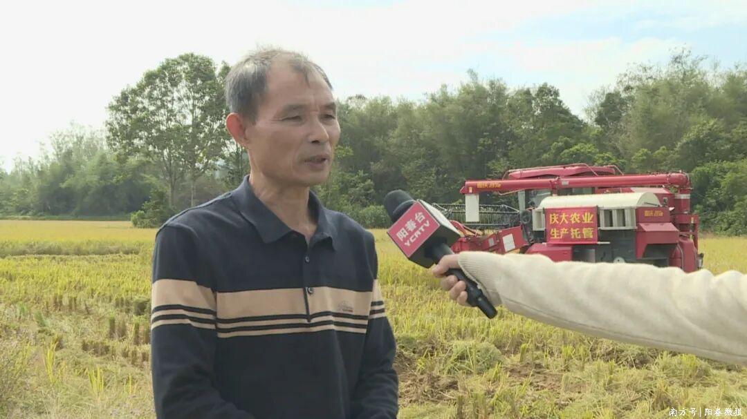 【采访】阳春市庆大农业发展有限公司经理 谢军:我们服务的亩数有13000多亩,从育秧到插秧到飞防到收割,还有来集中烘干,我们都有对应的服务。我们这段时间都在集中抢收,避免天气、虫害造成的损失。
