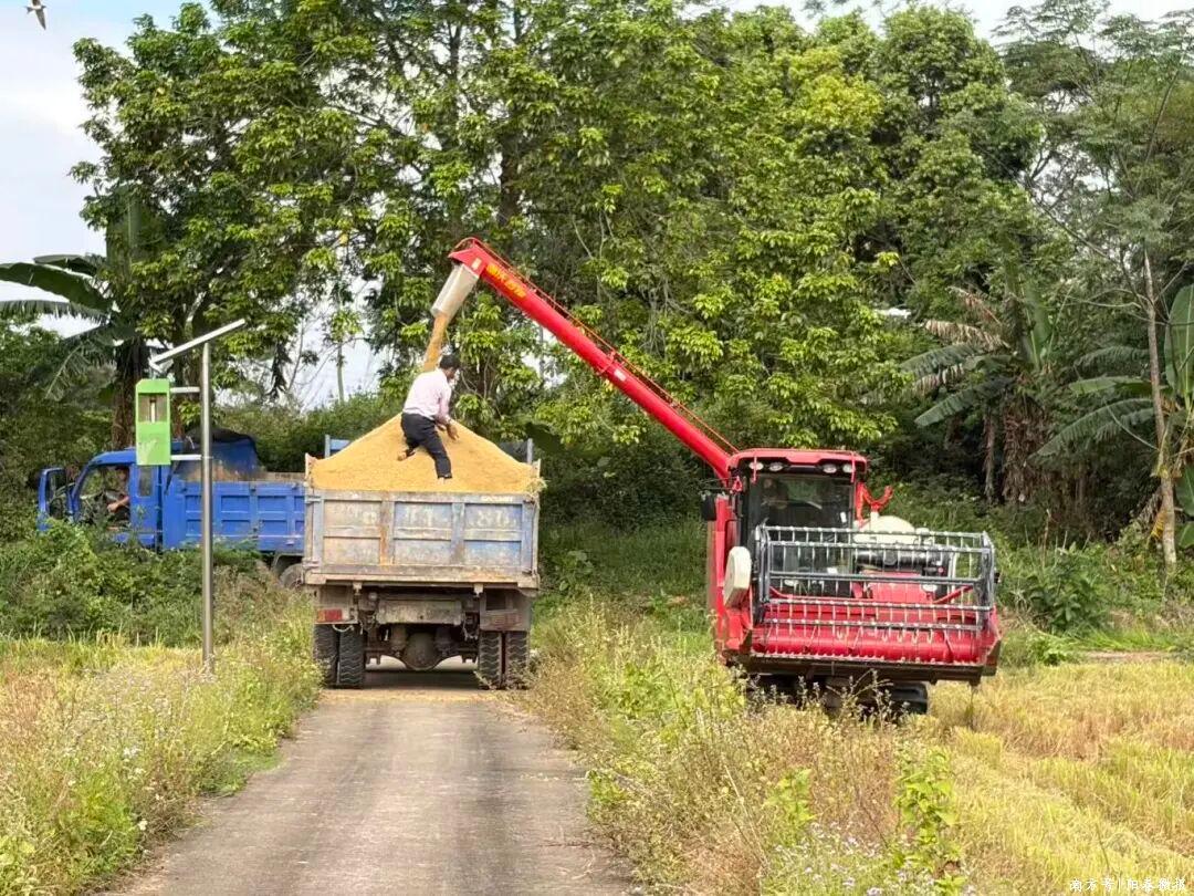 11月13日,记者在阳春市河口镇茶滩村委会天窝村的晚稻收割现场看到,沉甸甸的稻穗压弯了稻秆,金灿灿的稻浪在阳光下随风起伏,两台大型收割机正在金色的稻浪中来回穿梭。伴随着机器的轰鸣声,一排排水稻被迅速收割、脱粒,金黄的稻谷随即通过输送管装入运输车中。